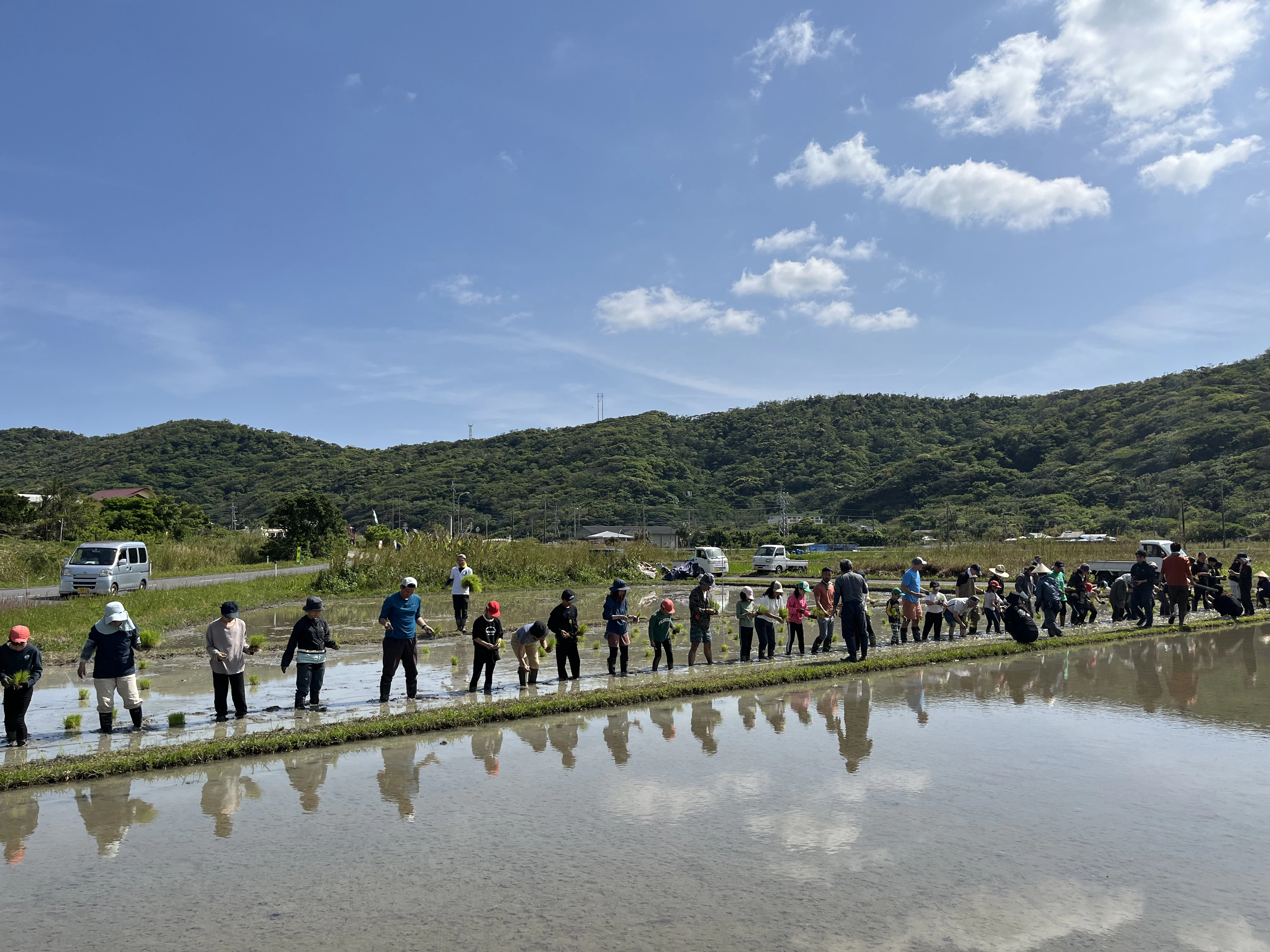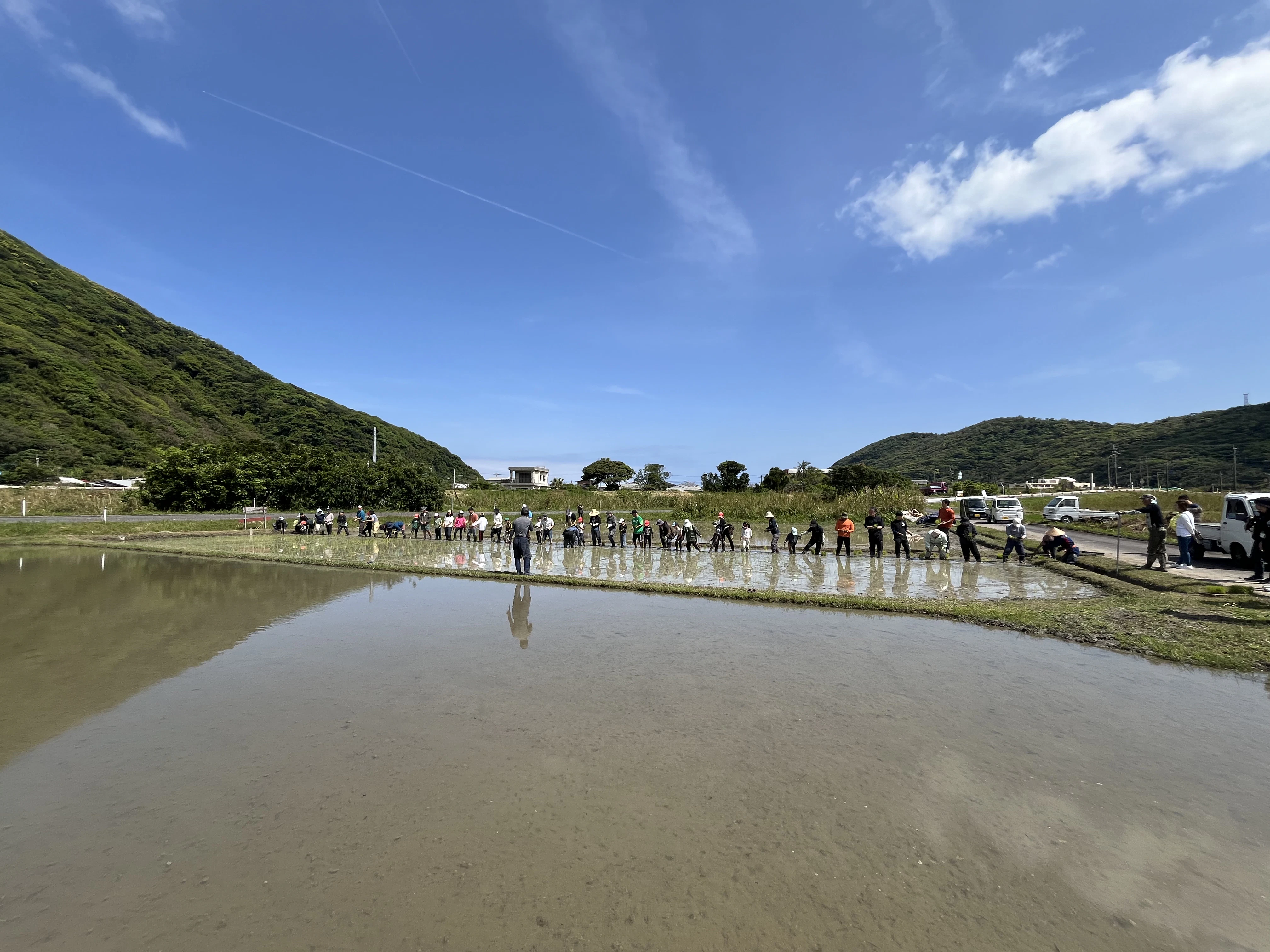 4月に奄美支所へ出張をした際、奄美大島で米作りをする「奄美稲作保存会」の田植え作業に参加しました。当日は、地域の小学校の田植え作業の日でもあったため、そちらにも参加させていただき、子どもたちと一緒に田植えをしました。